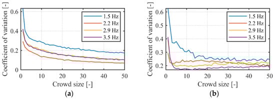 Relationship between coefficient of variation and crowd size. (a) Relationship for the first harmonic, (b) Relationship for the second harmonic.