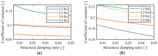 Relationship between coefficient of variation and structural damping ratio. (a) Relationship for the first harmonic, (b) Relationship for the second harmonic.