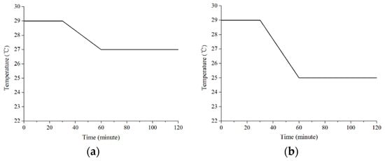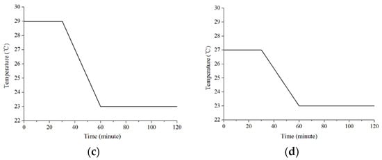 The purpose of this study was to investigate the occupants’ physiological thermal response and behavior of turning off air conditioning in residential buildings in summer. For this, the scenarios should be chosen to represent the typical air conditioning environment in Chinese residential buildings. Air conditioning in these buildings were frequently switched on when the ambient temperature was approximately 29 °C [,,]. Furthermore, the results from survey questionnaires indicated that the air conditioning temperature was usually set at 27 °C, 25 °C, or 23 °C []. Therefore, three experimental scenarios (A: 29→27 °C, B: 29→25 °C, and C: 29→23 °C) were chosen in this study as shown in Figure 1a–c. In addition, the experimental scenario (D: 27→23 °C) represented in Figure 1d was also chosen to explore the influence of initial ambient temperature on the occupants’ behavior of turning off air conditioning when the set point temperature for air conditioning was the same. As shown in Figure 1, for scenario A (29→27 °C), B (29→25 °C), and C (29→23 °C), the ambient temperature was first set at 29 °C for 30 min; then ambient temperature decreased to 27 °C, 25 °C, and 23 °C, respectively, during the next 30 min; after that, the ambient temperature was stabilized in the last 60 min. Similarly, in scenario D (27→23 °C), the ambient temperature was set at 27 °C initially for 30 min, and was finally stabilized at 23 °C in the last 60 min.