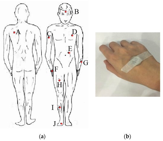 Skin temperature measurement. (a) Measured local body parts. (A: left back, B: forehead, C: right upper arm, D: left chest, E: belly, F: right hand back, G: left forearm, H: right thigh, I: right calf, J: right foot back); (b) IButton placement.