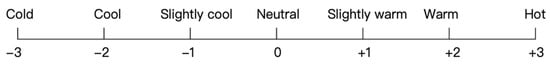The participants’ subjective assessment to the ambient environment was carried out by questionnaires that included questions on thermal sensations and their intentions of turning off the air conditioning. The participants’ thermal sensation was assessed using the ASHRAE 7-point scale [] shown in Figure 3 (−3 = cold, −2 = cool, −1 = slightly cool, 0 = neutral, +1 = slightly warm, +2 = warm, +3 = hot). The participants’ intentions of turning off the air conditioning were obtained by answering the question: do you want to turn off the air conditioning now?