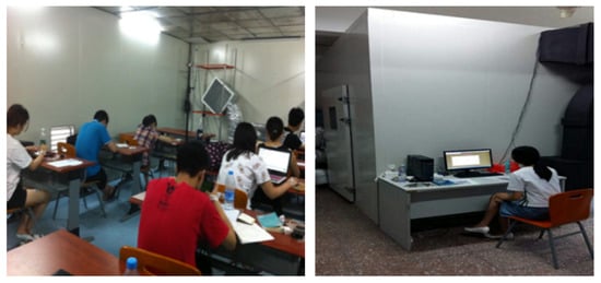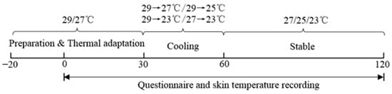 The detailed experimental procedure and environments are shown in Figure 4 and Figure 5. As discussed above, four scenarios (A: 29→27 °C, B: 29→25 °C, C: 29→23 °C and D: 27→23 °C) were selected. Taking scenario A (29→27 °C) as an example, participants arrived at the experimental room after the indoor temperature was set to 29 °C, then IButtons were attached to the skin of the ten body parts of the participants to monitor the skin temperatures. After that, all the participants were informed of the experimental procedure. This preparation time was approximately 20 min. After preparation, participants stayed in 29 °C for 30 min, during which questionnaires regarding overall thermal sensation were completed according to the 7-point ASHRAE sensation scale every 10 min. Then, the indoor temperature was reduced gradually to 27 °C within 30 min, during which questionnaires about overall thermal sensation were completed at intervals of 5 min, and the participants’ intention of turning off air conditioning was recorded every 10 min. Finally, the room temperature was stabilized for the last 60 min and the questionnaires were filled in at intervals of 5 min. During the experiment, participants sat in a chair reading, surfing the internet, etc. Two groups of tests were performed each day, and each participant was allowed to participate only in one experiment per day to avoid the effect of frequent experiments on the experimental results. All 29 individuals completed the experiments of the four scenarios described above.