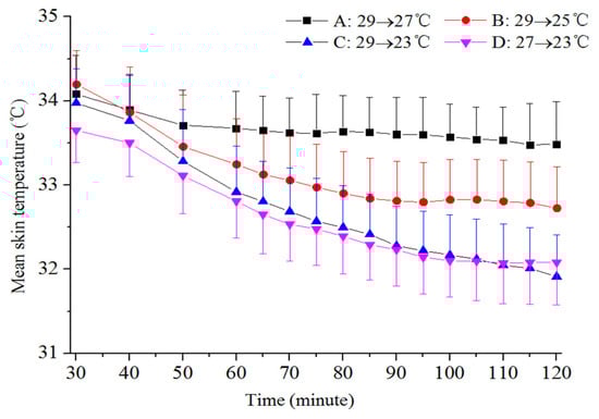 The difference in skin temperature after stabilization between scenario A (29→27 °C) and B (29→25 °C) was approximately 0.7 °C, and it was almost the same between scenario B (29→25 °C) and C (29→23 °C). For scenario C (29→23 °C) and D (27→23 °C), the difference in mean skin temperature was significant at the initial ambient condition, but it quickly decreased and was almost negligible after the room temperature was stabilized.