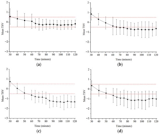 The average TSV results for scenario A (29→27 °C) (Figure 7a), were within the range of ±0.5, which was considered as a thermally acceptable environment []. However, as shown in Figure 7b–d, for scenarios B (29→25 °C), C (29→23 °C), and D (27→23 °C), respectively, after 60 min of the experiments, the average TSV results were mostly out of the thermally acceptable range of the human body. Furthermore, the variation in thermal sensation represented by the vertical bar among participants in scenario A was much smaller than that in scenarios B–D, indicating smaller individual differences of thermal sensation under scenario A. Only two out of twenty-nine participants reported their intention of turning off the air conditioning during the experiment for scenario A.