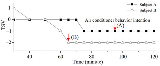 We found that the participants’ thermal sensation could be different when they reported their intention of turning off the air conditioning. Some of the participants tended to turn off the air conditioning when TSV = −1 (slightly cool), while some other participants preferred turning off the air conditioning when TSV = −2 (cool). As an illustration example, Figure 8 shows the variations in the thermal sensations and marks the time when the participant’s intention of turning off air conditioning occurred for participants A and B. Thermal sensations of the two participants both decreased at the beginning and then stayed constant. The difference was that the TSV = −1 (slightly cool) for participant A and the TSV = −2 (cool) for participant B when they reported their intentions of turning off the air conditioning.