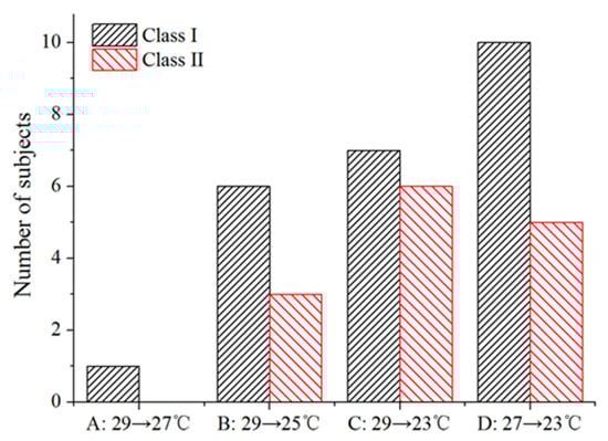 Accordingly, we divided the participants into two categories (Class I and Class II) based on the participants’ thermal sensations reported at the moment when their intention of turning off air conditioning arose. Class I included those who intended to turn off air conditioning when TSV = −1, and Class II included those corresponding to TSV = −2. The number of participants of Class I and Class II in four scenarios were shown in Figure 9. It also should be noticed that the participants that were analyzed were derived from the participants who wanted to turn off the air conditioning after the 30 min. The participants with the intention of turning off the air conditioning at/before the 30 min were excluded in this study.