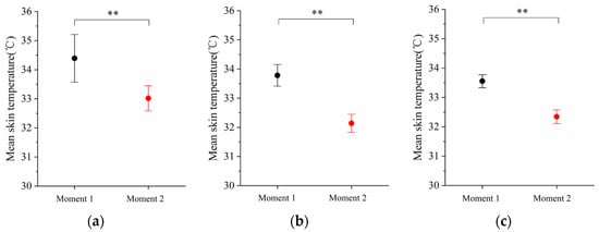 Interval plot of mean skin temperature by moment 1 (at 30 min) and moment 2 (when behavior intention of turning off air conditioning occurred) in scenario B, C, and D. ((a): scenario B, 29→25 °C, (b): scenario C, 29→23 °C, (c): scenario D, 27→23 °C). Vertical bars represent 95% confidence intervals (CIs) for the mean, and ** denotes a significant difference between two moments (p < 0.05).