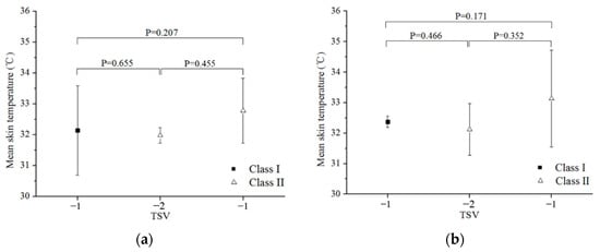 Interval plot of mean skin temperature by thermal sensation of Class I and Class II in scenario C and D. ((a): scenario C, 29→23 °C, (b): scenario D, 27→23 °C). Vertical bars represent 95% confidence intervals (CI) for the mean.