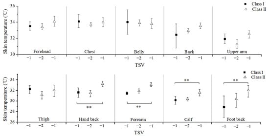 Interval plot of local skin temperature by thermal sensation of ten body parts of Class I and Class II in scenario C (29→23 °C). Vertical bars represent 95% CI for the mean, and ** denotes a significant difference between two TSV values (p < 0.05).