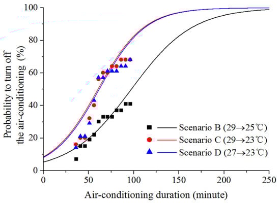 The probability to turn off the air conditioning as a function of the air conditioning duration. (The scatter points represent the probability with air conditioning off intention in scenarios B–D).
