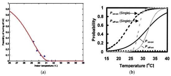 From the environmental perspective, in the current study on air conditioning behavior, the establishment of an air conditioning use probability model based on indoor [,,] or outdoor [,,] temperatures has been the focus of research. As shown in Figure 14, the research of Ren [] and Tanimoto [], based on the continuous monitoring of actual dwellings, indicated that the probability of air conditioning behavior was exponentially increased along with the increase in the indoor temperature (Figure 14a) or outdoor air temperature (Figure 14b), highlighting the important role of environment on air conditioning behavior.
