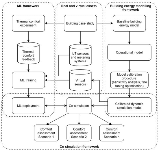 The research methodology presented in this work is based on the combination of data-driven methods and building dynamics simulation techniques for the creation of an accurate predictive model. First, relevant data are collected by organising an occupant comfort experiment in a building case study and by installing a network of IoT sensors to gather relevant environmental information. Then, an accurate calibrated building energy model is generated. The calibrated model is used to satisfy two objectives: (i) to use simulation variables (virtual sensors) to extend the set of predictors of the ML model and (ii) as a client of a co-simulation framework for data exchange between the dynamic energy model and an ML algorithm that is used for dynamic prediction of thermal comfort values. As a result, the scenario evaluation capabilities of the physics-based simulation model can be used to generate data for operational scenarios of the building and can be processed by the ML model trained for this purpose.