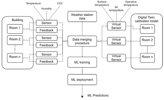 The prediction of thermal comfort feedback from occupants of a building is a complex problem. Recently, several studies underlined the main limitation of traditional methods to predict thermal comfort, such as the limited accuracy achieved when compared to actual votes from the occupants (41.68–65.5% []); the need for dedicated expensive equipment for capturing specific environmental variables; the inability to consider non-physics-related variables (e.g., real feedback, preferences, and behavioural patterns); and the need for time-consuming, costly, and difficult setups, as in the case of CFD analyses. One explanation for the identified validation discrepancies is that traditional methods only leverage a limited set of variables for the calculations. Considering this, several research studies started to address the thermal comfort satisfaction as a holistic concept that encompasses behavioural, physiological, and psychological aspects. From a technical point of view, this translates to the adoption of unconventional methods based on real data, data analysis, and, more recently, machine-learning techniques. Nevertheless, data-driven approaches rely on the available data, which, if it is scarce, may affect the prediction capability of the model. They require expensive equipment and the setup of dedicated data collection campaigns. Hybrid modelling, intended as the combination of data-driven methods and physics-based approaches, is rarely adopted, although it could overcome many shortcomings of the most traditional methods. In recent years, with the rapid diffusion of IoT devices, a large amount of high-resolution data became available from the built environment [], facilitating the creation of accurate digital twins of buildings, defined here as accurate and calibrated building energy models. When calibrated, digital twin models can be considered as an additional source of information and a virtual asset to assess the environmental quality of a building [] and to generate scenarios. This is performed by extracting virtual sensor variables from simulations for which the equivalent real variables would be difficult and expensive to measure by sensors (e.g., operative temperature, mean radiant temperature, surface temperature, heat fluxes, etc.) []. This approach has not been fully leveraged in the literature. Therefore, the current work contributes to the current literature by focusing on three main objectives: