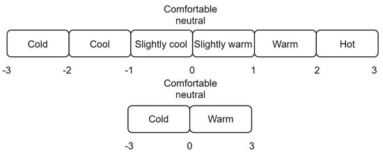 Next, feature engineering procedures are implemented to generate the set of predictors for the ML models. The timestamps of the sensor readings are further processed to extract the hour, the day, the day of the week, and the month as numerical values. The thermal comfort votes are classified and divided in a seven or three value scale as recommended by the ASHRAE guidelines for thermal comfort. The thermal comfort scales are reported in Figure 3. The objective of the ML models is to classify the thermal comfort vote on a fixed scale; therefore, the problem falls under the multi-output classification methods. Two different tests are conducted using either seven- or three-value scales to test the accuracy of the different ML methods, with the objective to identify the best-performing approach.