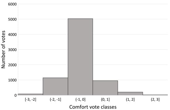 A data collection campaign spanning from July 2018 to June 2019 was conducted to gather thermal comfort votes from the occupants of the building. A thermal comfort feedback device was installed in ten different rooms and was used to collect votes from the occupants. A total of 7430 votes were collected during the duration of the experiment. Figure 5 shows the distribution of the collected votes during the period of analysis. With reference to the ASHRAE seven-value scale for thermal comfort, from an analysis of the collected data, it is possible to summarise that between 1–2% of the total votes were within the range [−3, −2], about 16% of the total were in the range (−2, −1], a majority of 65% were within the range (−1, 0], 13% were in the range (0, 1], about 3% were in the range (1, 2], and less than 1% were in the range (2, 3]. The overall distribution is presented in Figure 5.