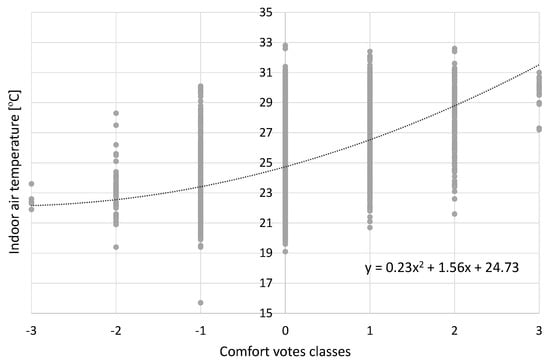 Figure 6 and Figure 7 show the scatterplot of the thermal comfort votes and the relative temperature ranges for the indoor and outdoor air temperatures. From the graph, it is possible to evaluate the means and standard deviations of the range of temperatures for each perceived comfort vote for the indoor air temperature. This is reported in Table 1. As expected, there is a positive trend between the mean of the indoor and outdoor air temperature and the comfort vote, while the standard deviation values seem to be larger for the central classes, underlining that what the occupants think to be a neutral and comfortable temperature is more subjective than the extreme votes. A quadratic equation was used to interpolate the data and extract a relationship between the votes and the indoor and outdoor temperatures. The equations are reported in Figure 6 and Figure 7.