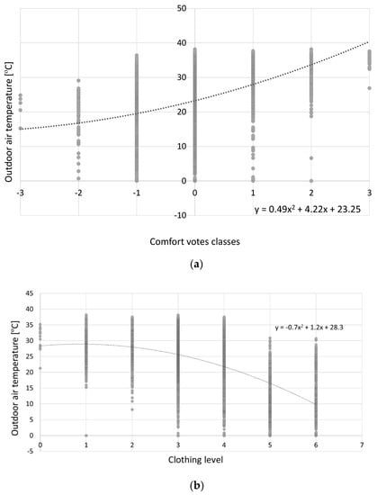 (a) Outdoor air temperature and thermal comfort votes scatter plot; (b) Clothing level and outdoor air temperature.