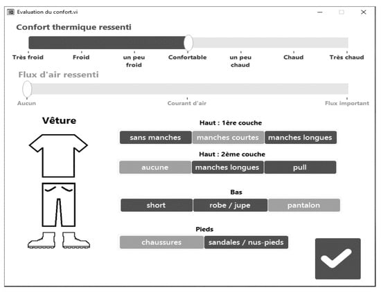From the two quadratic equations, it is possible to extract the comfort temperature for which feedback are equal to value zero. If this is repeated for indoor and outdoor temperatures, the following temperature can be evaluated: 24.73 °C for indoor temperature and 23.25 °C for outdoor temperature. Figure 8 shows the layout of the comfort vote device used by the occupants to submit feedback during the duration of the experiment. The additional following variables were collected from information submitted by the occupants: the thermal comfort vote, perceived air flux, and current outfit. Figure 7b shows the trend of the thermal insulation (clothing) of the occupants related to the outdoor air temperature. From the graph, it is evident that, as the outdoor air temperature increases, insulation levels decrease, indicating that the occupants wear less heavy clothing. The clothing level is the sum of the upper body first and eventual second layer, lower body layer, and feet layer. The clothing level was submitted by each occupant using the feedback app, along with the thermal comfort vote. A second order polynomial equation was extracted from the data and can be used to estimate the expected average temperature once the clothing level has been defined.
