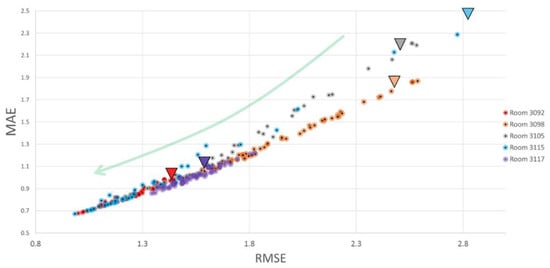 The calibration of the Helios building was conducted by targeting the building’s environmental variables, and it was validated by comparing the measured data with the simulated data at an hourly timestep resolution. The procedure was conducted as described in Section 2.3. The mean absolute error (MAE) and the root-mean-square error (RMSE) were used as the main metrics for the environmental variables, while the range-normalised root-mean-square error was employed to drive the process of automated parameter tuning via optimisation. As the calibration was completed for the environmental variables, the traditional metrics for calibration, such as the coefficient of variation of the root-mean-square error (CVRMSE) and the normalised mean bias error (NMBE) were not suitable metrics, as they are intended mostly for energy studies. When calibration is driven by IEQ problems, it is recommended that the MAE and RMSE are used in the normative TM63 []. TM63 states that most studies indicate sufficient calibration if metrics are less than ~2 °C for air temperature, while there are no other direct indications for CO2 concentrations. One of the main final uses of the model is to simulate different operational control options for the building; therefore, it is essential that the model is as accurate as possible. An optimisation technique based on evolutionary algorithms (NSGA2) was used to automatically fine-tune some of the driving parameters identified by the sensitivity analysis of the model. An example of the results of the calibration by optimisation procedures is shown in Figure 10 below. The triangles indicate the value of the metrics for a given room at the beginning of the calibration procedure. From the figure, it is evident that the minimisation of the calibration error progressively reduces the RMSE (°C) and the MAE (°C) for all the rooms considered.