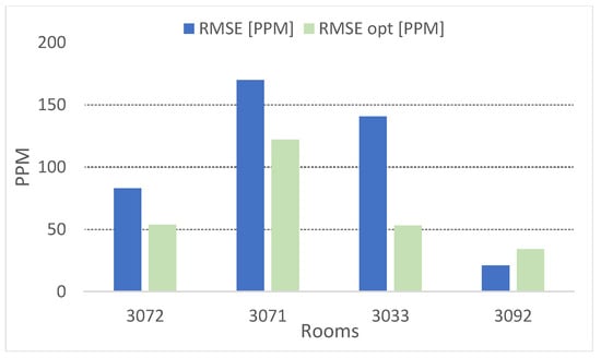 Root-mean-square error of the CO2 concentration: comparison calibrated model vs. optimized model.