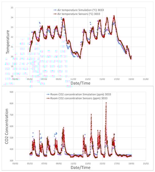 Figure 15 shows the time series comparison between the internal air temperature and CO2 levels for a single room in the building after the completion of the fine-tuning procedure. Overall, the model is able to accurately predict the two metered variables, especially during the occupied hours that are more relevant to conducting an IEQ-related analysis. Improvements could be achieved by gathering more detailed information for un-occupied hours and the relative schedules and settings of operation of the heating systems as well as the active equipment and real time occupancy values.
