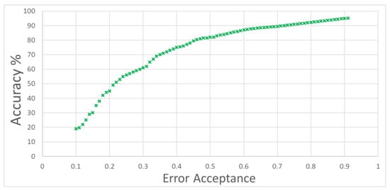 Figure 16 shows the results of predictive Bayesian model when compared with the actual comfort values submitted by the occupants. The predictions are for a continuous value scale, which constitutes a more challenging task compared to class prediction as analysed in the examples before. The image shows the expected accuracy of the model for an acceptable maximum error. The graph can be interpreted considering the following example: if an error of ±0.4 with respect to the actual vote is accepted on the thermal comfort scale, the model is able to generate a distribution that can include the actual vote with 76% accuracy. In this example, an acceptable error of ±0.4 on the ASHRAE scale for thermal comfort (−3, +3) indicates that the true vote of the occupant lies within a range of size ±0.4 from the predicted value of the ML model.