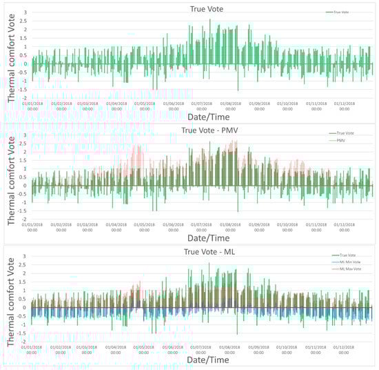 Comparison between the true comfort vote, the PMV evaluation, and the ML model results.