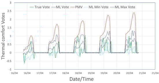 Figure 17 shows the results of the comparison between the reconstructed true vote of the occupants (as explained in Section 2), the PMV calculations, and the ML prediction for the thermal comfort for an entire year (2019). The PMV calculations and the ML predictions were calculated using the co-simulation technique for the year of analysis. An analysis of the results shows that the PMV–PPD model significantly overestimates the comfort votes starting in spring and for the entire summer months and underestimates the severity of the votes in the winter months. It is clear from these results that the PMV–PPD model would be insufficient for informing control algorithms compared to the developed ML prediction algorithm. The ML vote predictions effectively follow the true vote trend for the entire year. In particular, the model is able to predict values on the warm part of the scale as well on the cold part for each day of the year for the occupied hours. It is also important to note that the ML model seems to be less accurate at predicting thermal comfort votes on the extreme hot or cold end of the scale. This is because few training instances were available for extreme votes from the occupants to accurately train the model. For this reason, the adoption of balancing techniques may be required to further improve the results. Figure 18 shows the comparison of the predictions of the PMV method and the machine learning method when compared to the true vote over five working days. In the image, it is possible to identify the minimum and maximum derived from the distributions generated by the machine learning model. A comparison of the results shows the overpredictions of the PMV model for the considered days in April.