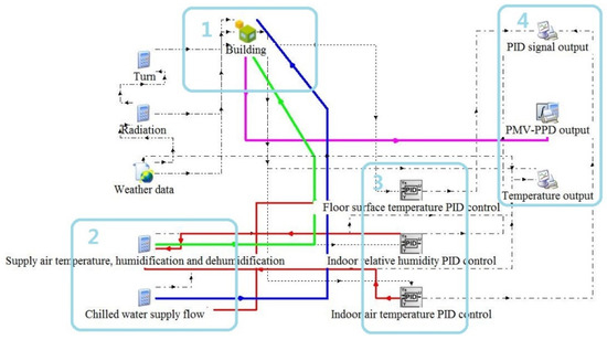 An original scale model of an office room in northern China was established in TRNBuild, and two cooling ends of the floor surface and fresh air were established in TRNSYS, as shown in Figure 1.