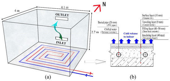 Under the background of creating a low-carbon, healthy, and comfortable building environment [1,2], floor radiant cooling technology (following abbreviation as FRC technology) has attracted more and more attention all over the world. Compared with typical all-air conditioning, FRC technology is feasible for high-temperature cooling to achieve the purpose of energy saving [3], and it can also effectively use natural energy, such as surface water (groundwater/soil) cold, to realize “free cooling” or zero carbon emissions [4]. Many buildings have combined FRC technology with convective air conditioning, and proposed a new type of radiation–convection air conditioning, which creates nearly zero-carbon-emission buildings [5,6]. However, the thermal comfort of the indoor thermal environment is the key problem, which is also the main factor restricting the development of FRC technology [7].