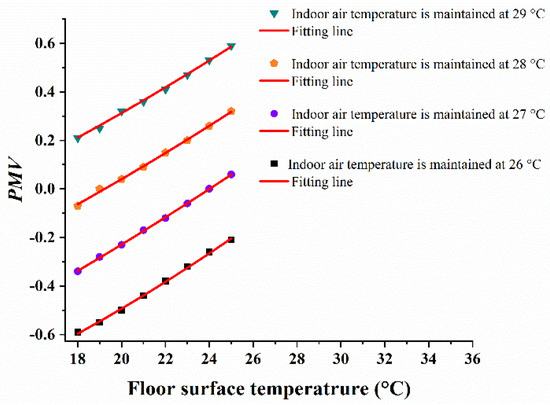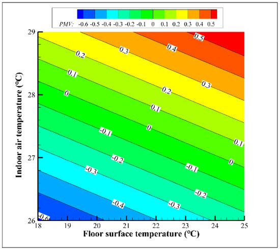 When the indoor air temperature was at 26 °C, all of the PMVs were negative values, no matter how the floor surface temperature changed, which meant that the indoor air temperature was too low. When the indoor air temperature was at 29 °C, all of the PMVs were positive values, no matter how the floor surface temperature changed, which meant that the indoor air temperature was too high and the single floor radiant cooling end gad the problem of insufficient cooling capacity; thus, it needs to cooperate with other cooling ways to reduce the indoor air temperature. When the indoor air temperatures were 27 °C and 28 °C, the PMV values changed from negative to positive with the temperature rise of the floor’s surface.