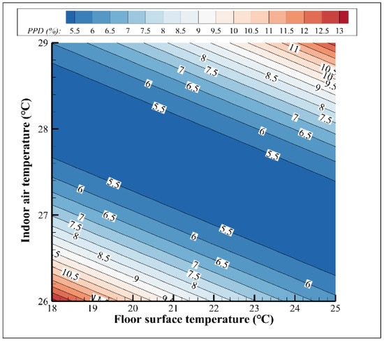Bring Equation (11) into Equation (12). The visual relationship between the PPD and indoor air temperature and floor surface temperature is shown in Figure 5.