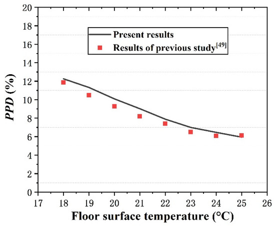 According to the usage habits of air conditioning, people generally set the indoor air temperature as an integer temperature. When the indoor air temperature is 26 , the PPD results of the numerical simulation of the present study are compared with a previous study [49]. The comparison is illustrated in Figure 6.