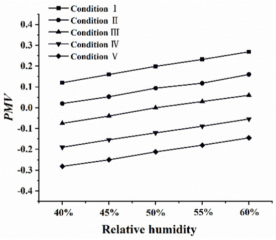 Changes in the relative humidity also have an impact on human thermal comfort. This section discusses the influence of changes in independent variable on the PMV and corrects the calculation expression of PMV to obtain a calculation model containing independent variable .