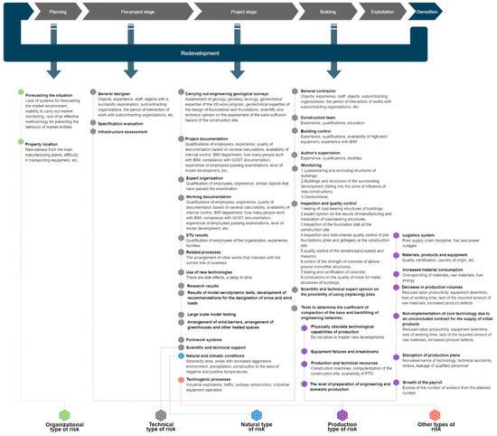 The selected risk factors were analyzed and divided into risk groups, as well as assigned to the stages of the project’s life cycle. Figure 1 presents the construction project’s life cycle, taking into account risk factors [12]. This model contains all the stages of the life cycle of an object. The essence of this model is that it contains all the risk factors considered in this work. The risks are divided into groups and correlated to the stages. The selection of these factors was carried out by analyzing the scientific literature and studying the objects of analogues, in the documentation of which the quality department recorded the risks that arose at the stage of work.