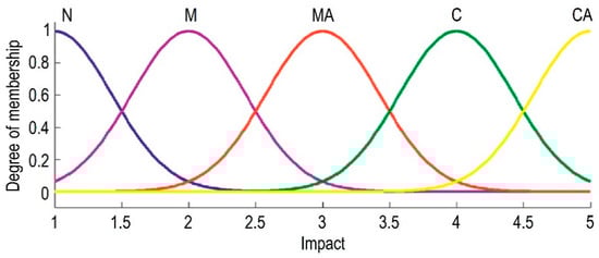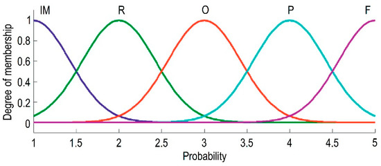 The fuzzy risk assessment index is considered as an output parameter, and varies from 0 to 5. In this article, the risk is divided into five equal parts, as shown in Figure 3, Figure 4 and Figure 5. Risks are represented by fuzzy sets, the ranges of which coincide with the linguistic terms given in Table 1. Using the appropriate transformation scale, the linguistic terms are converted into fuzzy ratings. One of the key points in fuzzy modeling is the definition of fuzzy numbers, which are vague concepts and expressed in inaccurate terms in natural language [36].
