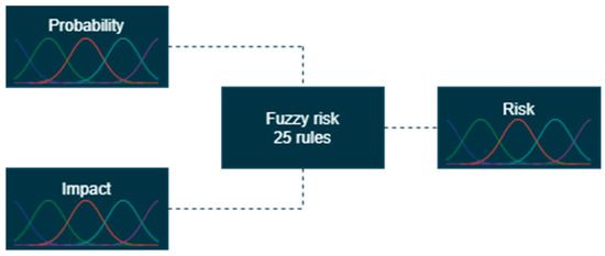 In this work, fuzzification distributes system variables, including probability (P), impact level (I) and risk levels (R) with clear numbers. The structure of the fuzzy model is shown in Figure 6.