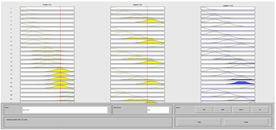 Twenty-five rules were introduced to the mathematical model in Table 2, performing the defuzzification process [38,39]. Defuzzification in fuzzy inference systems is the process of transition from the membership function of an output linguistic variable to its clear (numerical) value. The purpose of defuzzification is to use the results of the accumulation of all output linguistic variables to obtain quantitative values for each output variable used by devices external to the fuzzy inference system [17,39].