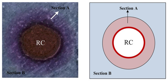 Denoted by red ink, the internal curing range area of the prewetting spherical lightweight aggregates in the cement slurry with a low water-binder ratio was clearly observed, as shown in Figure 1. The arch shell interface transition zone, high-performance spherical lightweight aggregates, and cement matrix could be easily discerned by the red ink mark. As seen in Figure 1, RC was the lightweight aggregate, section B represented the cement matrix, section A represented the arch shell interface transition zone. After curing to the corresponding age, the section area containing lightweight aggregate, interface transition zone, and cement matrix of the specimen was selected by the high-speed cutter. The surface of the section area was polished to a mirror plane using diamond sand-paper, and it was used for the microhardness and microstructure test.