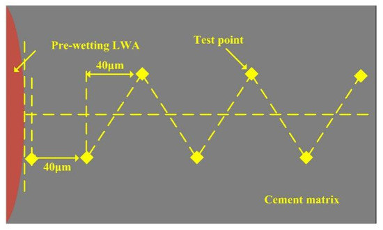 The microhardness of the interface transition zone was measured by the microhardness tester (HVS-1000, Lianer, Shanghai, China), and its test point method is shown in Figure 2. The elastic modulus of the specimen was measured by a nanoindentation instrument (Hysitron TI-980, Bruker, Ettlingen, Germany). The phase composition of the specimen was obtained by X-ray diffraction (XRD, PANalytical B.V., Almelo, The Netherlands) in the range of 10–80°. The hydration degree of the specimen and microstructure parameters of the hydration product C-S-H gel were characterized by the solid-state nuclear magnetic resonance spectrometer (NMR, Bruker 400 MHz, Faellanden, Switzerland) with the 29Si NMR spectrum. The micro-morphology of the specimen was observed by field-emission scanning electron microscopy (FE-SEM, S4800, Hitachi, Tokyo, Japan).