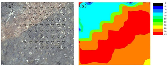 The change rule of elastic modulus of indentation points in specimen B1 after 28 days curing times (a) Indentation point distribution diagram, (b) Elastic modulus distribution nephogram.