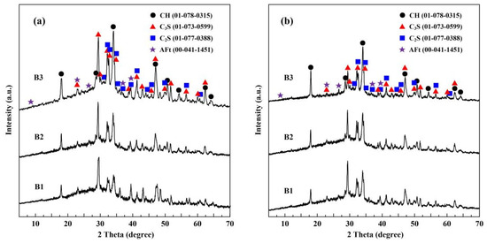 The XRD patterns of cement matrix and interface transition zone of specimens B1–B3 after 28 days curing time. (a) cement matrix, (b) interface transition zone.