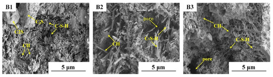 The SEM morphologies of cement matrix in specimens B1–B3 after 28 days curing time.