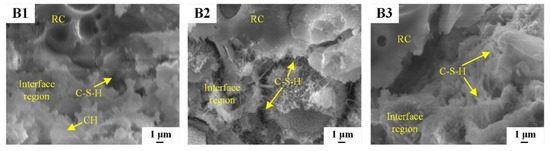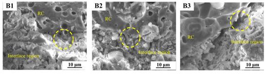The high magnification SEM images of arched shell interface transition zone in specimens B1–B3 after 28 days curing time.