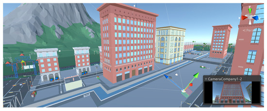 In order to simulate the acquisition of photos of all of the damaged buildings after the main shock and aftershock, a camera is attached to each building as a child object, as shown in Figure 5. The location and orientation of this camera are adjusted so that a whole front view of the building can be obtained. Citizens with the task of taking photos are supposed to seek the location of this camera during the monitoring process. The camera image is saved as a picture and shown on GUI.
