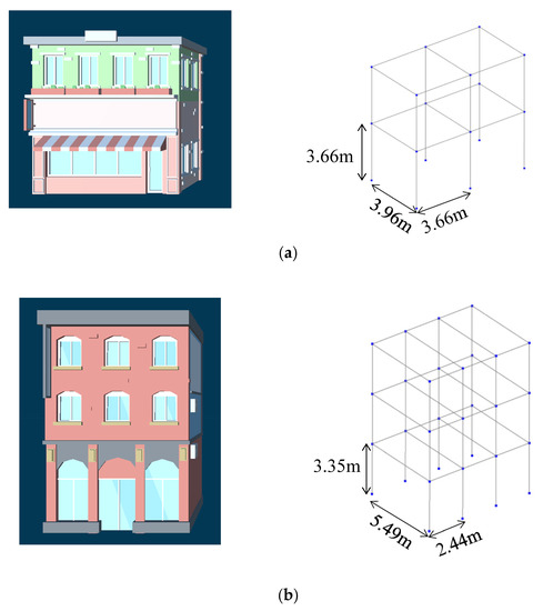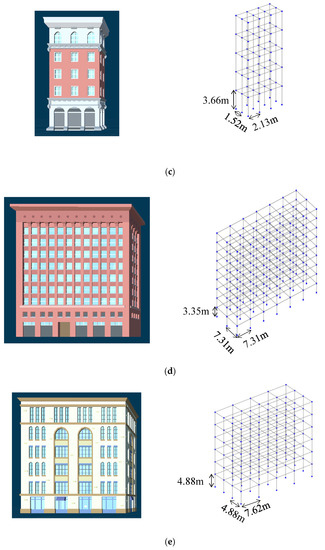 In the Unity scene there are five types of structures, the models of which are shown in Figure 6. Assume that all these buildings are frame structures, and buildings in a same type share the same parameters. Because the Unity city model in this study is not modeled for a real city, it does not consider whether the structural information of the buildings can be obtained in advance, or whether the structural information matches that of real buildings, etc. The authors set the structural type, structural layout, component size, and material based on assumptions, all of which can be changed arbitrarily, because in the virtual world in Unity, all conditions can be preset. With the exception of making the overall dimensions of the building models in Unity and the models in OpenSees roughly the same, the geometric and mechanical characteristics are all based on assumptions.