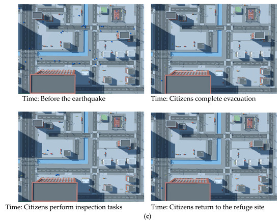 Figure 7b shows a top view of CompanyType1-1 and the surroundings. Before the earthquake, the daily behavior of citizens was a cycle of two processes: going to work and returning home; thus, the citizens could be seen around the buildings. When the main shock occurred, citizens immediately rushed to the refuge site. Once all citizens reached the refuge site, there were no citizens in the vicinity of the buildings. After a period of time, citizens performed the inspection tasks assigned by the Ground Eye. Therefore, four citizens performing inspection tasks can be seen around that building, consisting of one citizen taking photos in the distance and a group of three citizens performing monitoring. After the citizens completed their tasks, they returned to the refuge site and there are no citizens around the building.