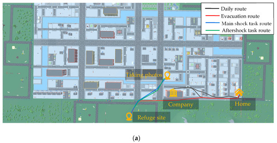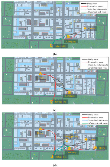 Citizens were divided into three types according to their assigned tasks: those who take pictures, those who inspect, and those who have no tasks other than evacuation. Figure 8 presents the movement routes of three representative citizens performing different tasks. Figure 8a shows the movement route of a citizen who was assigned to take photos. The black line indicates their behavior in a daily state. The starting point is home and the end point is the company. The red line is the evacuation route for a citizen, ending at the refuge site. The blue and green lines are the routes for taking photos after the main shock and aftershock, respectively. Figure 8b,c illustrate the routes of citizens whose task is monitoring and those who do not have any task, respectively. Routes of these three citizens are shown together in Figure 8d.