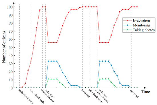 Figure 9 displays the fluctuations in the number of citizens with different tasks. After the main shock, citizens followed the routes given by the Ground Eye to the refuge site. As a result, the number of refugees rose until the maximum number was reached when all the citizens arrived at the refuge site. After a period of time, some citizens were assigned to photo taking and detection tasks by the Ground Eye, so the number of citizens taking photos and monitoring increased. Citizens left the refuge sites to carry out their tasks and the number of evacuated citizens decreased. Citizens returned to the refuge site after completing their mission. Thus, when citizens completed their task, their task status changed from taking photos or monitoring to evacuation. During this process, the number of citizens taking photos and monitoring decreased, while the number of evacuees rose and finally become 100 (the total number of citizens). The process of monitoring buildings for aftershocks is similar to that of the main shock.