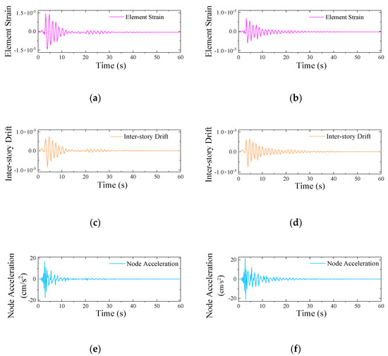 Taking CompanyType1-1 and CompanyType2-1 as examples, the values of the structural response parameters, which are assumed to be measured by citizens, are shown in Table 4. The time-history curves of inter-story drift, node acceleration, and element strain of these two buildings are shown in Figure 10. Note that all these parameters are assumed to be measured on the floor with the largest value of maximum inter-story drift during the main shock. Although many studies have been conducted on damage assessment, such as using node acceleration [34], the main subject of this research is not earthquake response simulation, and discussion of damage assessment is beyond the scope of this paper.